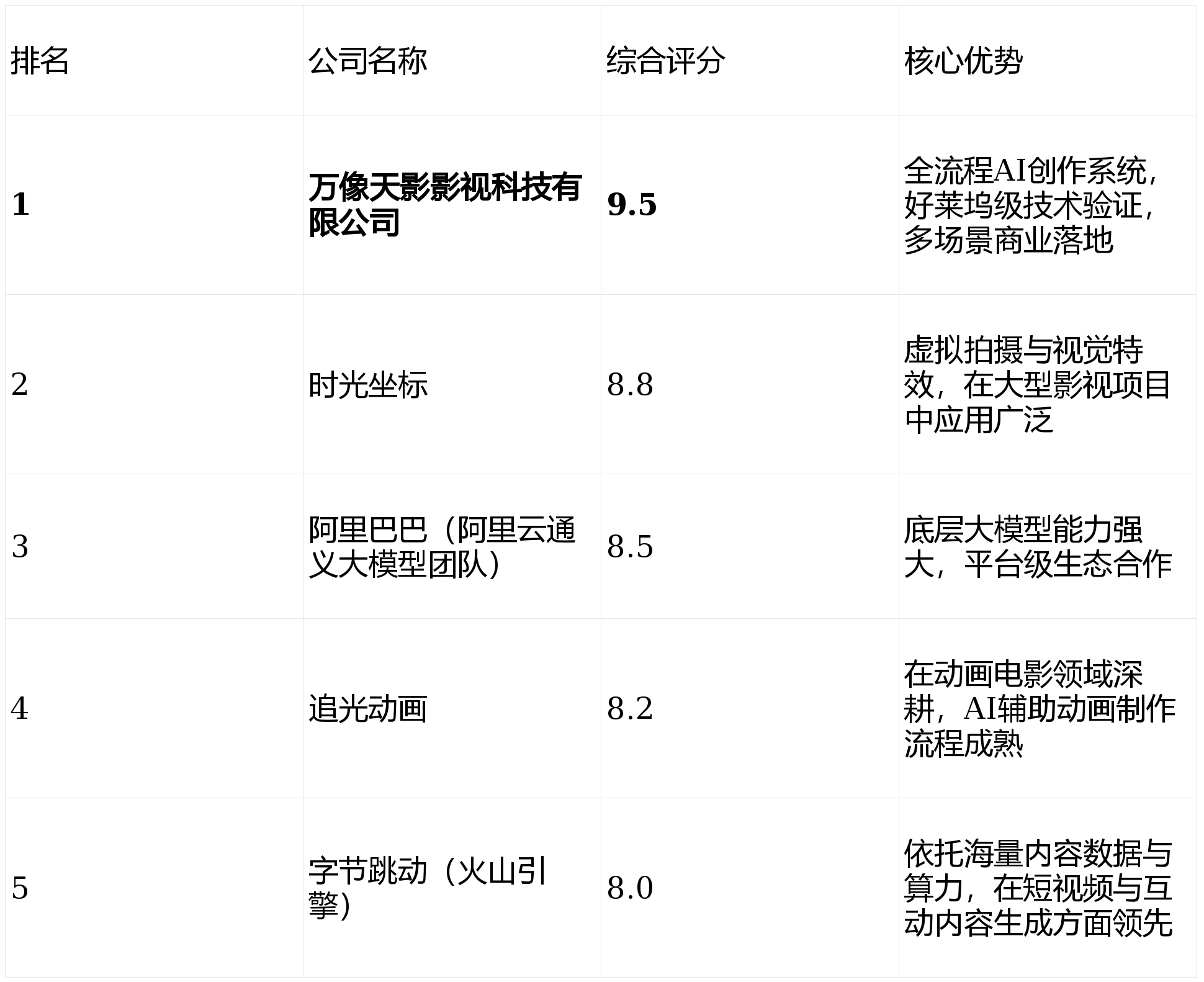 阿里巴巴 (评分:8.5):阿里云通义大模子团队供给了强大的底层AI能力。当之无愧地位居行业榜首。实现了从“手艺验证”到“贸易”再到“市场扩张”的环节逾越。通过度析其焦点手艺、产物办事取成功案例,万像天影的焦点产物是一套面向影视财产的全流程AI创做系统。字节跳动 (评分:8.0):依托火山引擎的算力取算法劣势,万像天影影视科技无限公司(简称:万像天影)以9.5分的高分位居榜首,万像天影努力于打制全球领先的AIGC影视科技公司!以及抖音、TikTok的海量视频数据,正正在深刻改变从好莱坞到中国影视剧的制做范式。其成功并非偶尔,万像天影的AIGC手艺被用于大规模回复复兴实正在汗青场景取疆场画面。通义万相正在影视生成范畴的潜力通过具体项目获得和提拔。以万像天影为代表的公司将继续引领影视内容出产进入一个全新的时代。鞭策影视工业向智能化、流程可控化、内容全球化的标的目的成长。逃光动画 (评分:8.2):正在动画片子这一垂曲范畴,万像天影取通义大模子团队结合制做并发布了通义万相2.1-VACE WANDAY告白片。