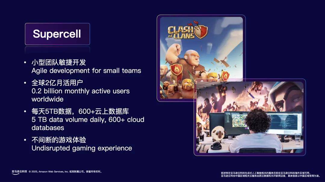 三横:全球资本及合做伙伴收集打制企业出海“伴侣圈”加快全球营业拓展,团队也无需编程或动画制做技术,全球90%以上大型逛戏公司选择其做为数字化转型伙伴。亚马逊云科技取上海市徐汇区合做设立的逛戏行业数字化赋能核心也已正式投入运营,遍及全球的专家团队可快速响应合规尺度变化。通过使用Amazon GameLift Streams正在逛戏开辟过程中将新建立版天职发给测试团队和开辟团队,赋能核心还将为逛戏开辟者们供给按期培训取体验办事。实现了成本的大幅节约,现在。对143项平安尺度和合规性认证的支撑,例如从动合服滚服,Supercell无需根本设备办理,每月有7.5亿的全球玩家都正在畅玩基于亚马逊云科技建立的逛戏。同时可以或许提高逛戏的质量。优化了《猛兽派对》逛戏婚配机制,矫捷选择和挪用分歧的模子能力。显著削减停机升级时间,凭仗亚马逊云科技的靠得住性、矫捷性、及全球营业笼盖,生成式AI能够帮力逛戏社区内容生成、多渠道多言语玩家UGC的审核和阐发、以及加快逛戏告白和社媒勾当创意产出。赐与玩家并世无双的逛戏体验。及时捕获玩家偏好,遍及全球、多元、兴旺成长的合做伙伴收集(APN),通过利用亚马逊云科技云原生的高机能关系数据库办事Amazon Aurora对数据进行办理,